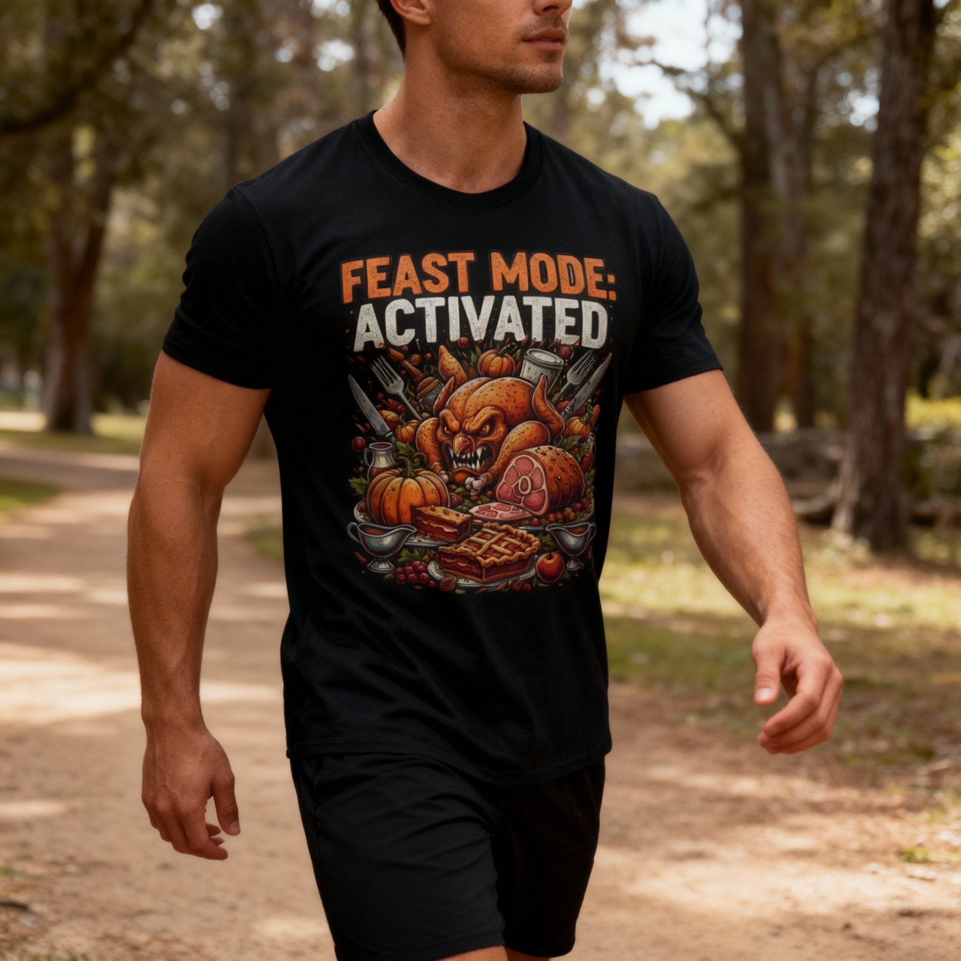 A funny holiday T-shirt featuring the phrase 'Feast Mode: Activated'. This T-shirt offers a comfortable fit and is perfect for anyone looking to add a touch of humor to their holiday season wardrobe. Ideal for adults celebrating Thanksgiving or Christmas.