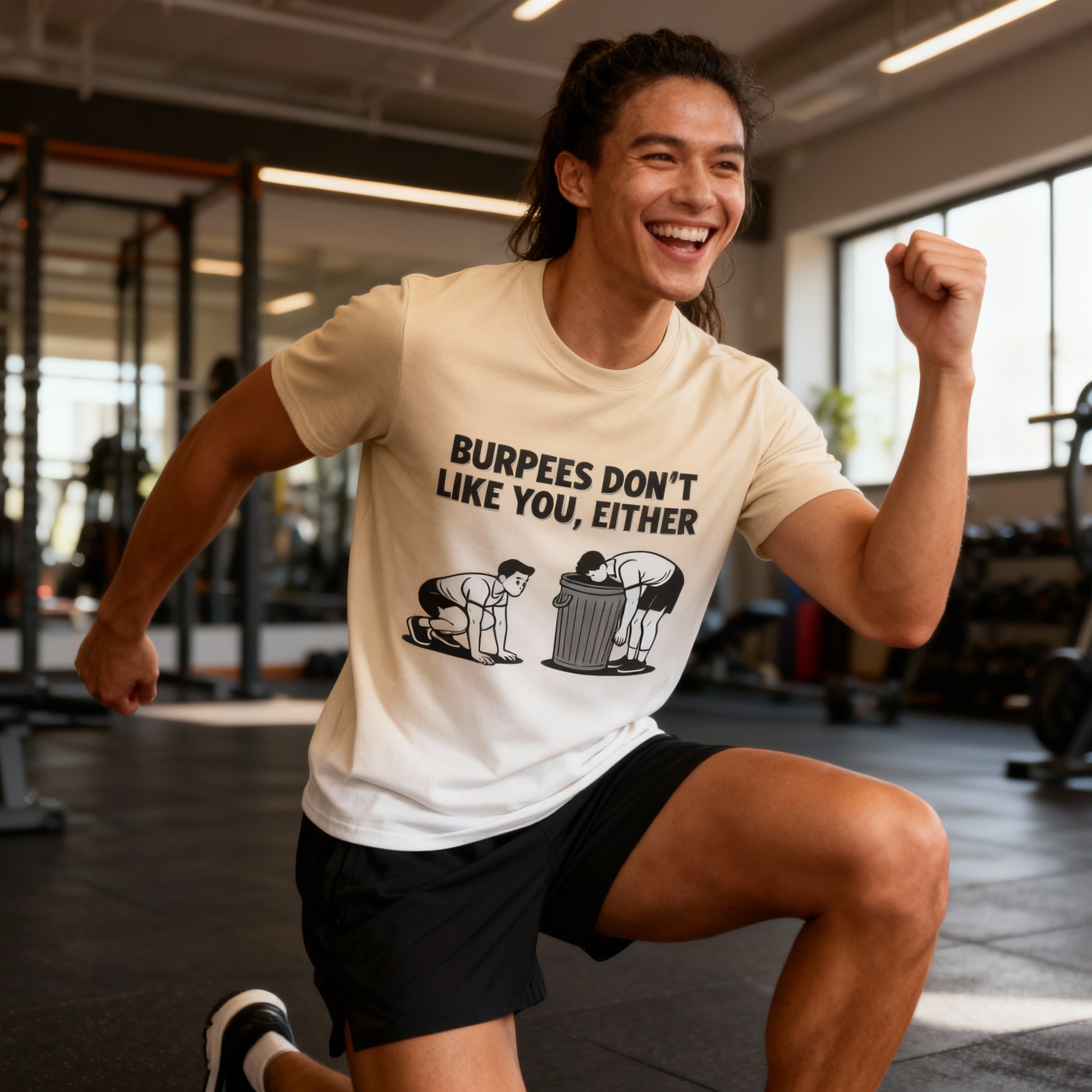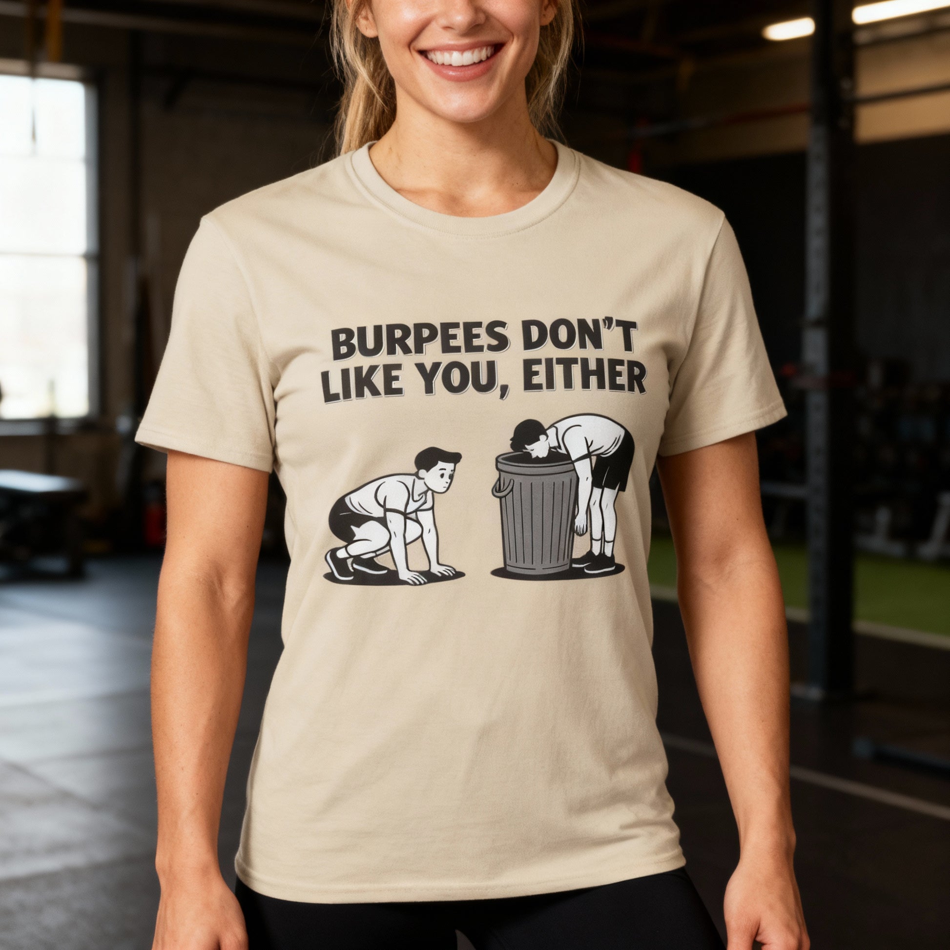 Funny 'Burpees don't like you, either' gym T-shirt that exudes a playful and witty vibe. Perfect for fitness enthusiasts and gym-goers who appreciate humor in their workout attire. Ideal for casual wear or as a conversation starter at the gym. Relevant for Fitness enthusiasts, gym-goers, CrossFit lovers, and those who enjoy a good laugh while working out. Suitable for occasions like gym sessions, workout classes, casual outings, and fitness-related events.